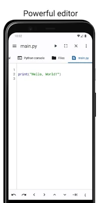 Editor - Run python code - Auto indentation - Auto save - Undo and Redo. - Support for characters not normally present in the virtual keyboard like tabs and arrows.