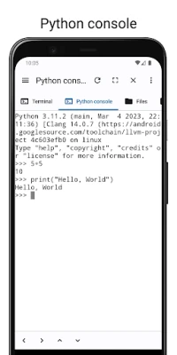 Terminal - Preinstalled python3 and python2 - Access the shell and commands that ship with android. - Support for tab and arrows even if the virtual keyboard lacks them.