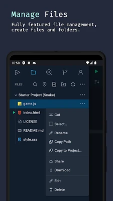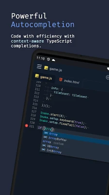 Spck Editor Lite lets you write code on your Android device. Make changes quickly with the power of TypeScript autocompletion, code snippets, and on-screen extra keyboard. Preview HTML files and debug them. Sync your changes with any git repository. Clone from Github/Gitlab/Bitbucket, AWS CodeCommit, Azure DevOps, or more, make commits and push them from your phone.